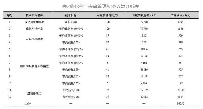 以某1000MW機(jī)組為例,假設(shè)能夠?qū)⒋呋瘎┗瘜W(xué)壽命由3年延長至3.5年、節(jié)約還原劑耗量5%、降低脫硝及空預(yù)器運(yùn)行阻力300Pa,則可年節(jié)約催化劑成本50萬元、還原劑成本40萬元、能耗(水、電、汽耗)成本160萬元,總計(jì)可節(jié)約脫硝運(yùn)行成本250萬元/年。假設(shè)國內(nèi)某發(fā)電集團(tuán)192臺(tái)77770MW SCR脫硝機(jī)組催化劑統(tǒng)一實(shí)施全壽命管理模式后,基于當(dāng)前運(yùn)行現(xiàn)狀,通過折算對(duì)應(yīng)裝機(jī)的催化劑采購成本、還原劑消耗成本、能耗成本,如表2所示,可節(jié)約脫硝運(yùn)行費(fèi)用約1.63億元/年。因此全壽命管理模式實(shí)施后,將能夠有效提升脫硝裝置運(yùn)行可靠性、減少脫硝裝置運(yùn)行成本。